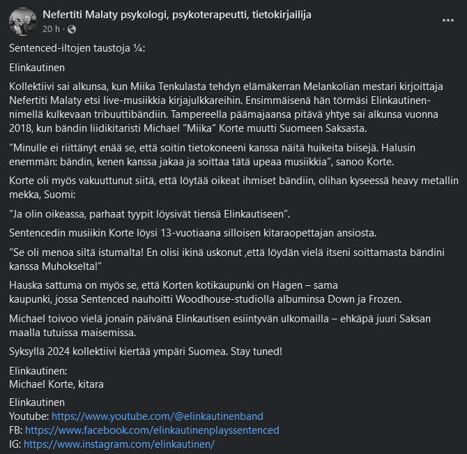 “At an Elinkautinen gig you get the best experience to witness Sentenced classics. Almost like Sentenced has risen from its grave.” – Joonas K.